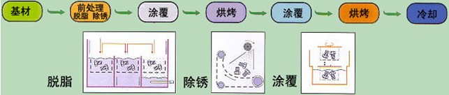鋅鉻漿液經(jīng)浸涂、刷涂或噴涂于鐵基零件或構(gòu)件表面,經(jīng)320℃左右高溫烘烤,形成裹覆在表面的完整、堅(jiān)固的防腐層,達(dá)到防護(hù)目的。